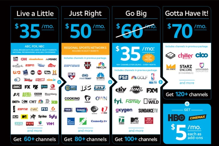 DirecTV delivers 65–150+ live TV channels, including sports, movies, and news, with flexible pricing.